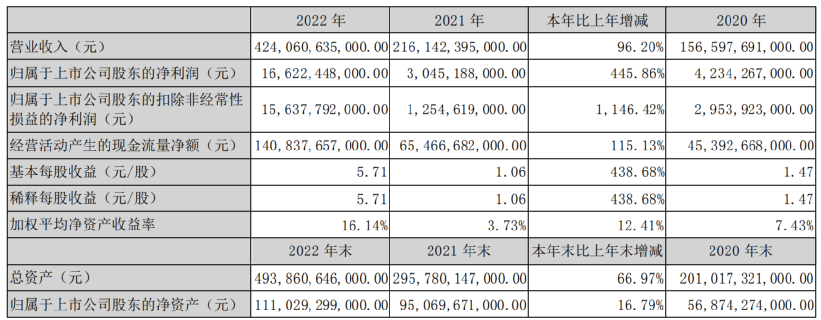 该公司去年营业收入为4240.61亿元,同比增长96.20%。该公司去年实现归母净利润为166.22亿元,同比增长达到445.86%。而扣非归母净利润为156.38亿元,同比增长达到1146.42%。不仅如此,从经营活动现金流净额来看,比亚迪去年达到1408.38亿元,同比增长115.13%。