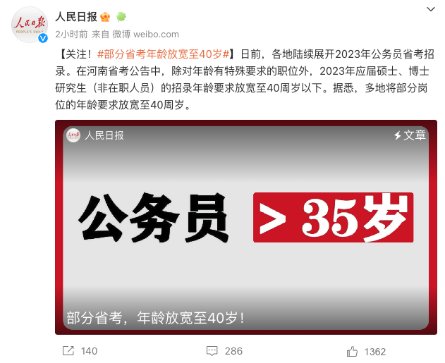 记者在2023年河南公务员省考公告中发现,除对年龄有特殊要求的职位外,2023年应届硕士、博士研究生(非在职人员)的招录年龄要求放宽至40周岁以下(1982年1月以后出生),而过去年龄限制通常为35周岁以下。贵州、天津、湖北、江西、广西、四川、云南、重庆、内蒙古等地在个别基层岗位或专业技术岗位条件上也放宽了年龄限制。