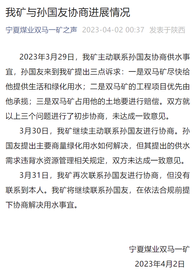4月2日,“宁夏煤业双马一矿之声”微信公众号发布《我矿与孙国友协商进展情况》。