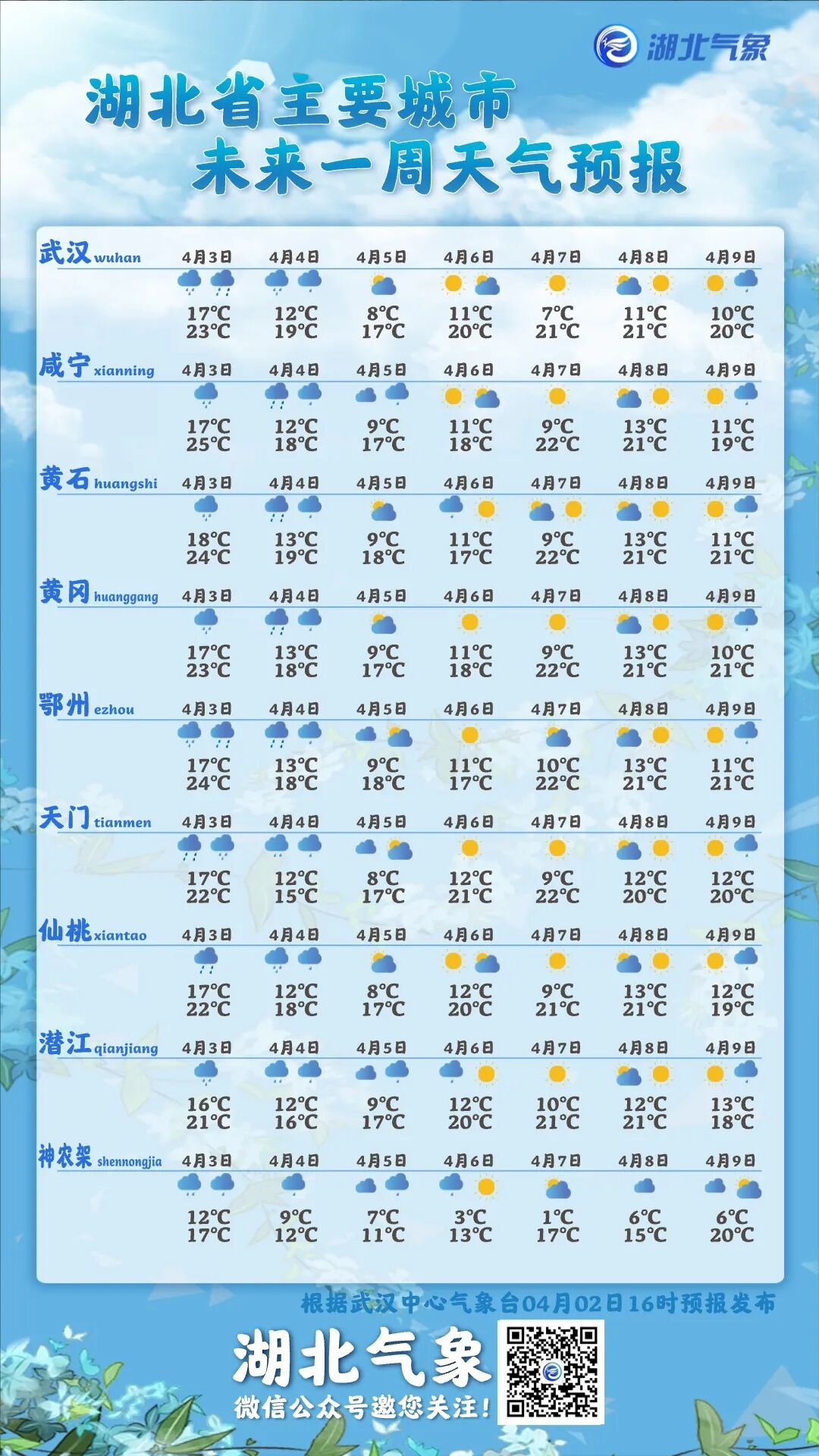 最低气温:鄂西北11~14℃;其他地区14~18℃