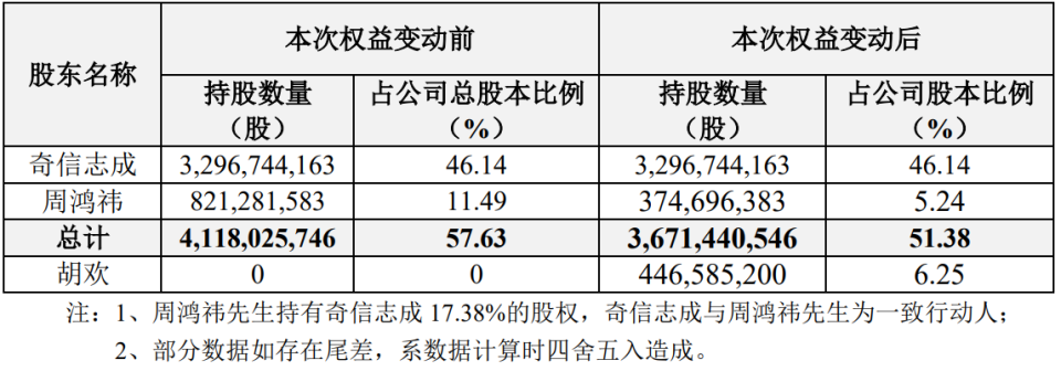 本次权益变动后,周鸿祎先生直接持有公司374,696,383股股份,约占公司总股本5.24%(剔除回购专用账户中的股份数量后的比例为5.35%),通过奇信志成间接持有公司股份未发生变动;胡欢女士拟直接持有公司446,585,200股股份,约占公司总股本6.25%(剔除回购专用账户中的股份数量后的比例为6.38%),成为公司持股5%以上股东。