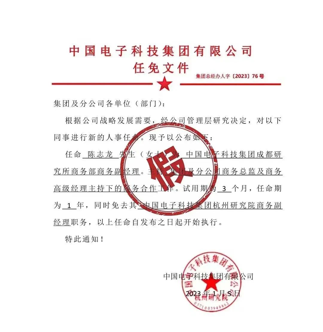 这份成文于2023年1月5日的文件称,“任命陈志龙先生(女士)为中国电子科技集团成都研究所商务部商务副经理。主持集团及分公司商务总监及商务高级经理主持下的商务合作工作。试用期为3个月,任命期为1年,同时免去其中国电子科技集团杭州研究院商务副经理职务,以上任命自发布之日起开始执行。”