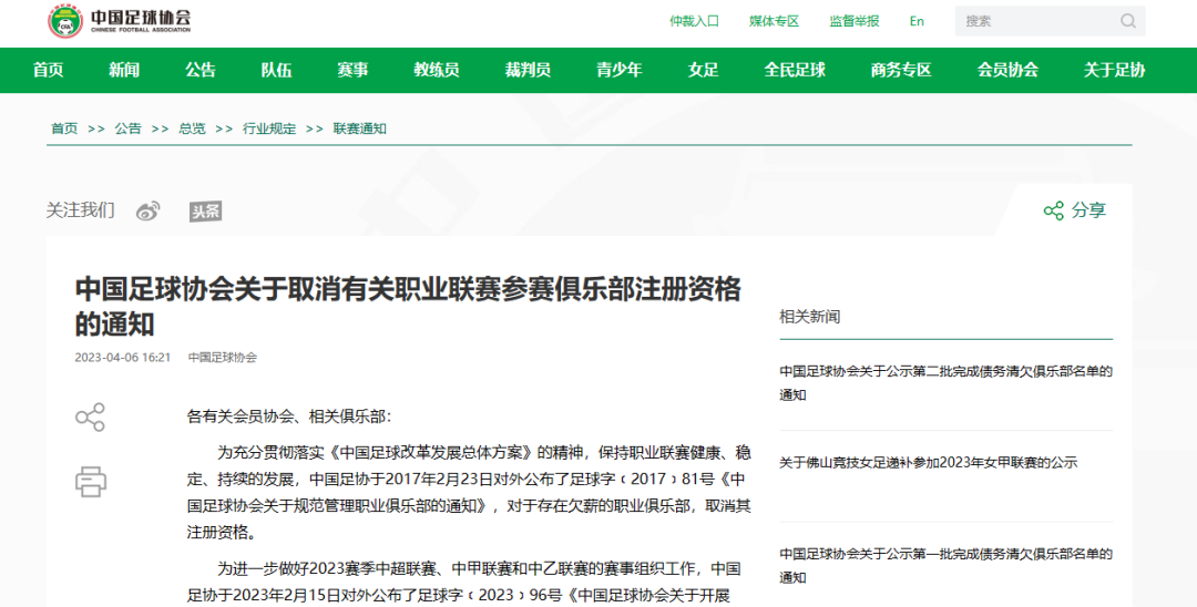 4月6日,中国足球协会网站发布《中国足球协会关于取消有关职业联赛参赛俱乐部注册资格的通知》,全文如下: