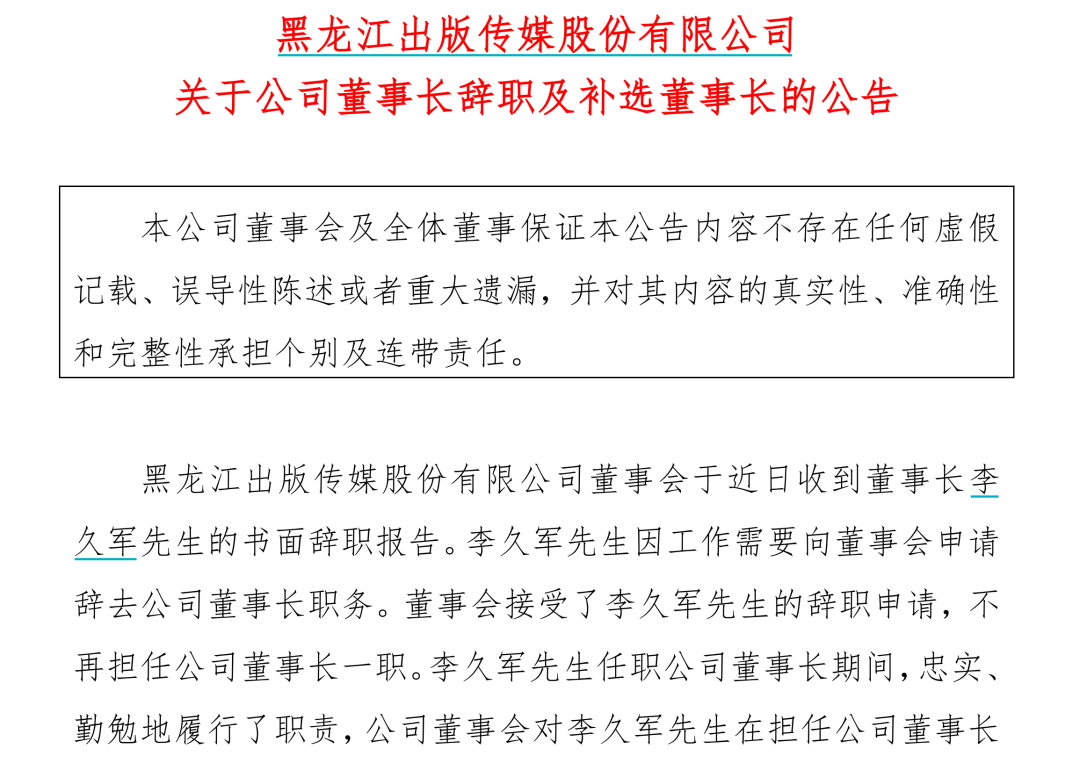 2021年4月6日,龙版传媒公告称,公司董事会于近日收到董事长李久军的书面辞职报告。李久军因工作需要向董事会申请辞去公司董事长职务。