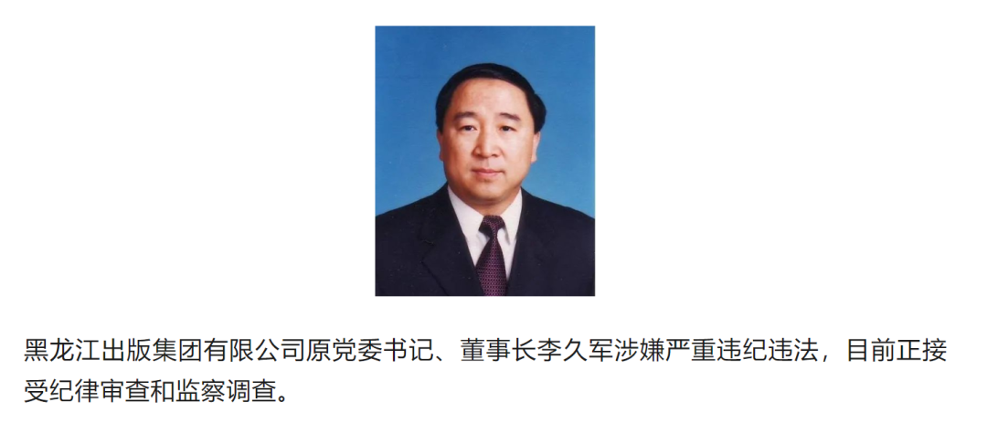 刚刚,据黑龙江省纪委监委消息,黑龙江出版集团有限公司原党委书记、董事长李久军涉嫌严重违纪违法,目前正接受纪律审查和监察调查。
