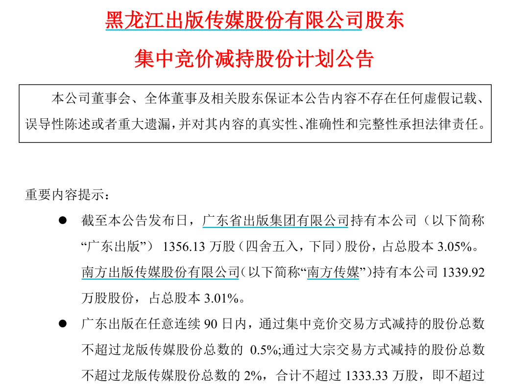 无独有偶,4月6日,第三大股东广东省出版集团和第四大股东南方传媒纷纷表示,两家合计减持不超过1778万股龙版传媒。