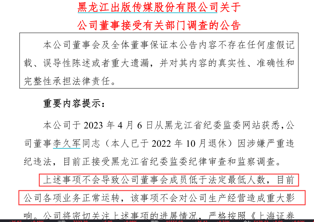 刚刚,龙版传媒发布公告表示,上述事项不会导致公司董事会成员低于法定最低人数,目前公司各项业务正常运转,该事项不会对公司生产经营造成重大影 响。