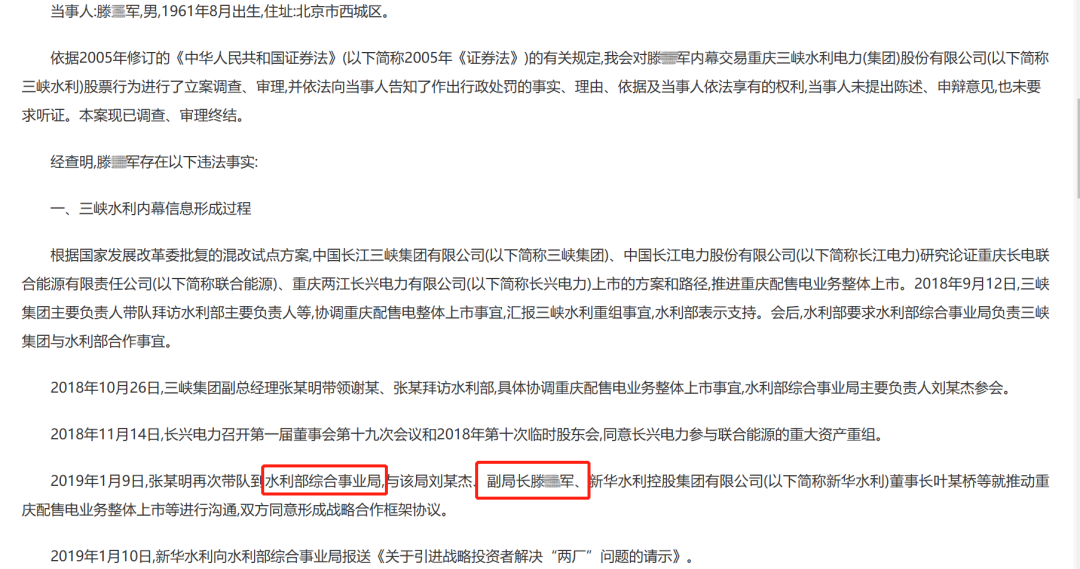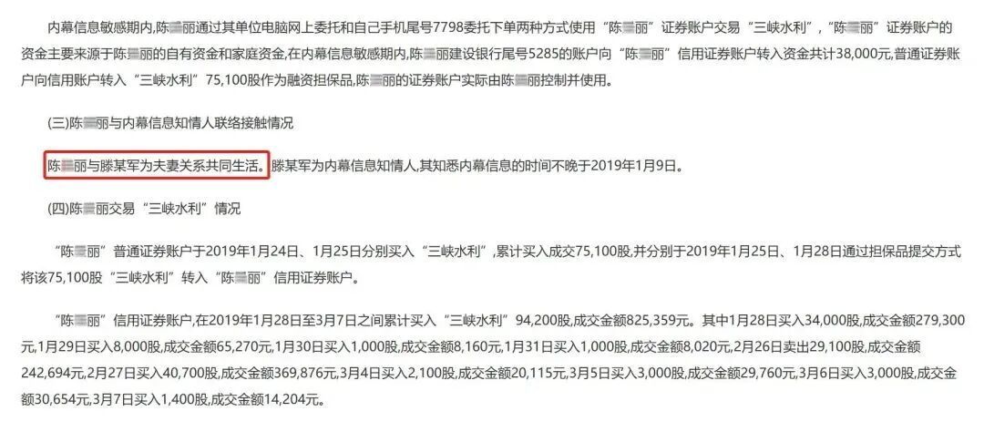 证监会的另一份处罚决定书显示,滕某军的妻子也参与了内幕交易“三峡水利”。