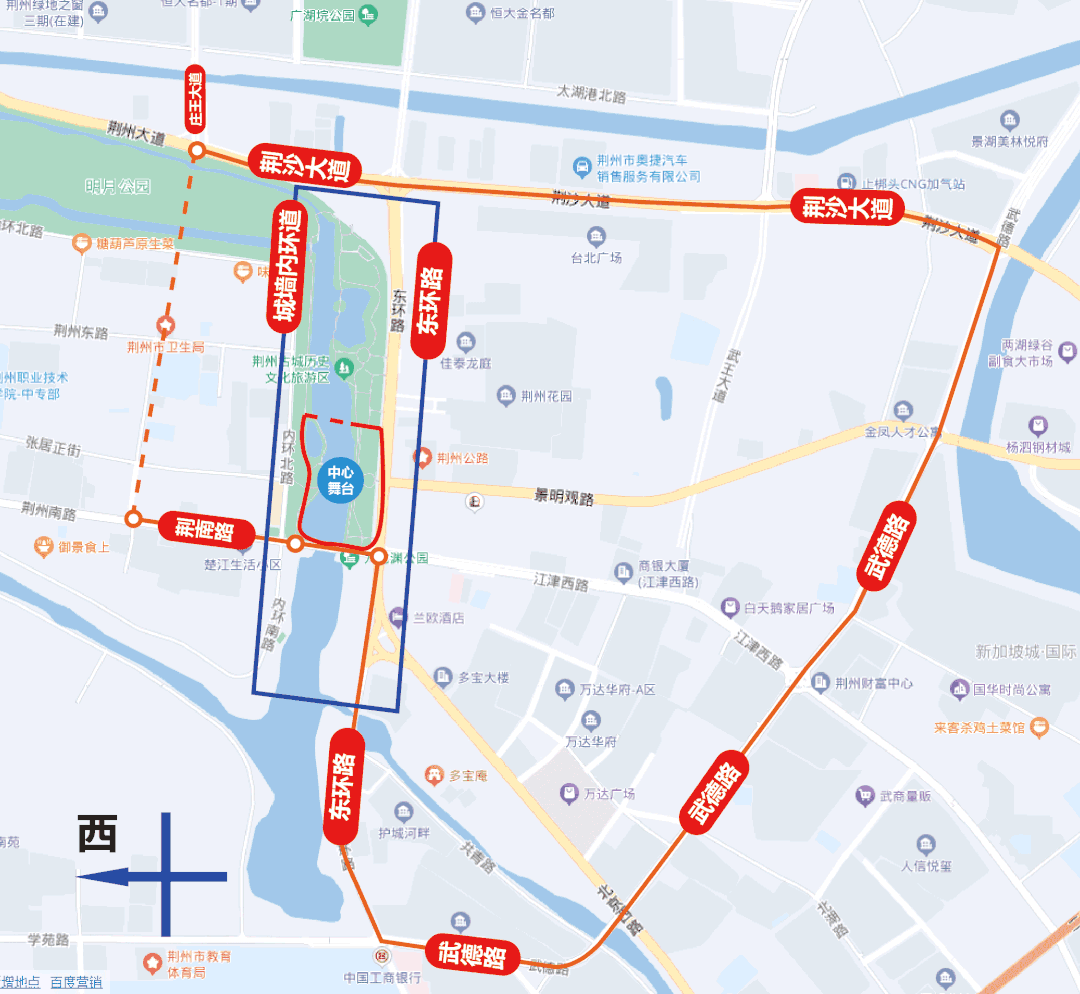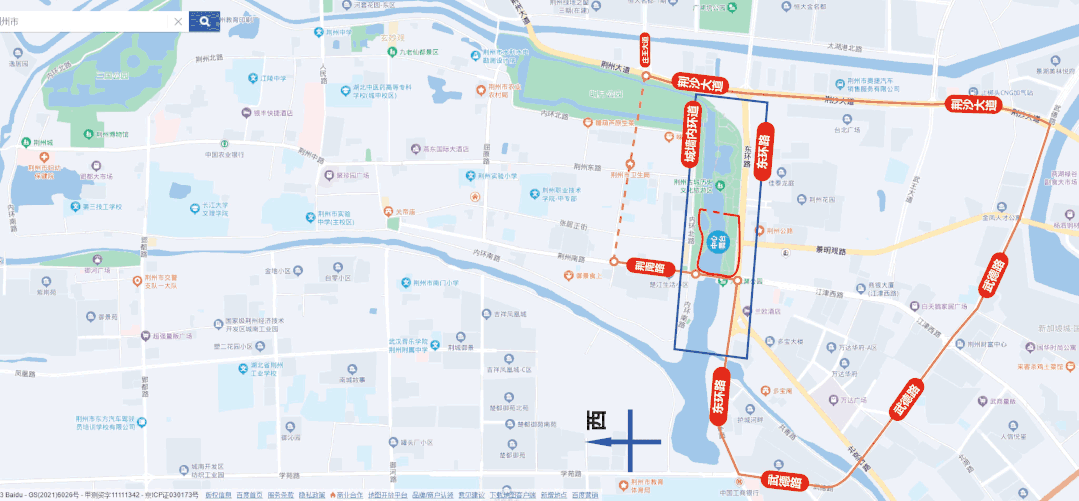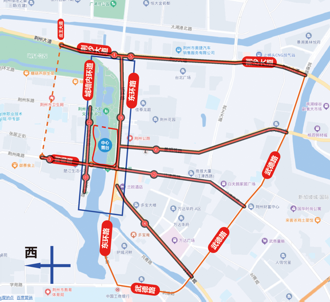 4.行经管制路段的车辆,由东往西方向行驶的,可通过学苑路、复兴大道绕行;由西往东方向行驶的,可通过荆中路、屈原路、荆北路、郢都路分别从新北门、小北门、新南门绕行。