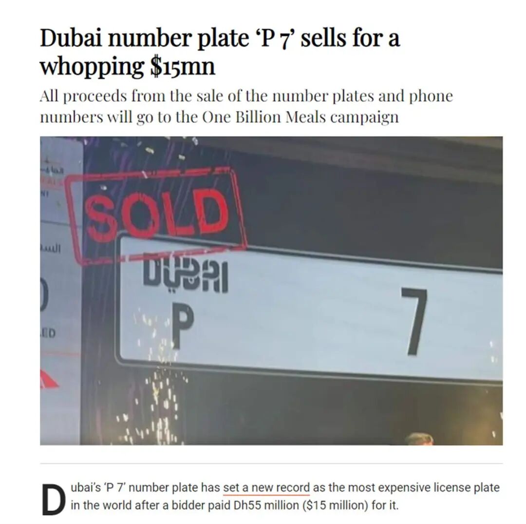据介绍,参加此次拍卖会的均是迪拜各界名流,他们希望以拍卖捐赠的方式来支持“10亿餐”捐款活动,为弱势群体提供食物,并向需要帮助的人传递来自阿联酋的善意。“P7”车牌引起了一波竞购战,几位竞购者热衷于打破车牌价格2008年创下的纪录。当年,一位商人以5220万迪拉姆的价格买下了阿布扎比的1号车牌。此次拍卖会,一位竞标者最终以5500万迪拉姆(约合1.03亿元人民币)的价格买下“P7”车牌号,创下了世界上最昂贵的车牌的新纪录。