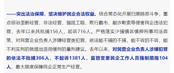 其中提到,结合常态化开展扫黑除恶斗争,重点惩治垄断经营、非法经营、强揽工程、欺行霸市、敲诈勒索等侵害民企违法犯罪,去年以来共批捕156人,起诉716人。严格落实少捕慎诉慎押刑事司法政策,对民营企业负责人涉嫌经营类犯罪,依法能不捕的不捕,能不诉的不诉,能不判实刑的就提出适用缓刑的量刑建议。去年以来,对民营企业负责人涉嫌犯罪的依法不批捕306人,不起诉1381人,监督变更民企工作人员强制措施104人,最大限度保障民企正常生产经营。