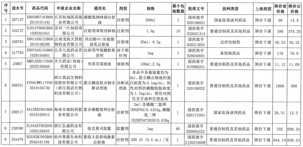 挂网药品价格和医保支付标准调整表
