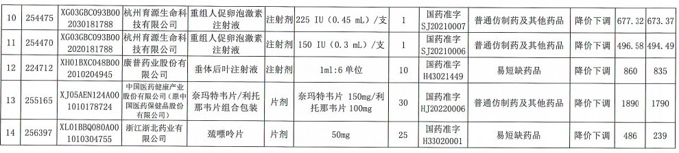 调整部分挂网药品价格信息