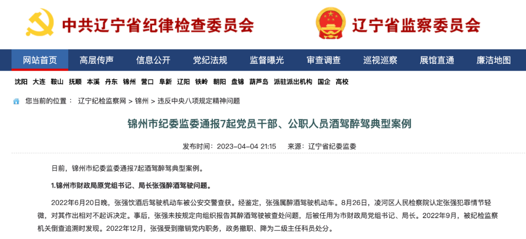 其中,锦州市财政局原党组书记、局长张强醉酒驾驶问题就排在首位。