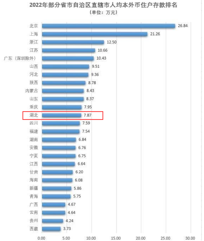 据了解,2022年,湖北省人均本外币住户存款为7.87万元。