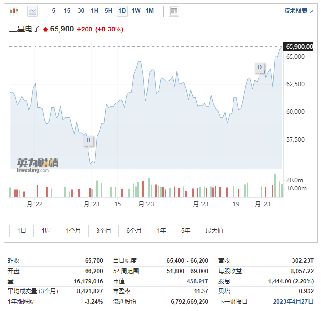 当地时间4月7日,三星电子(KRX:005930)发布了2023年第一季度业绩指引公告。财报显示,2023年一季度,三星电子预计营收约为63万亿韩元(约合人民币3300亿元),同比减少约19%;运营利润约为6000亿韩元(约合人民币31.3亿元),同比下降近96%。这也是自2009年第一季度以来,三星电子十四年来首次季度营业利润跌至1万亿韩元以下。当日一同公布的还有三星电子的减产计划。在业绩高压下,三星电子一改之前不会人为减少产量的态度,发布声明称将把内存芯片的产量削减到“有意义的水平”。半导体部门一直是三星电子的主要利润来源,巅峰时一度贡献了公司80%的利润。然而从去年开始,该部门贡献利润占比一路走低,继去年第四季度闪存业务出现亏损后,今年第一季度三星的动态随机存取内存业务也转为亏损。据香港券商中信里昂证券(CLSA)预测,三星电子半导体部门第一季度将出现3.3万亿韩元的营业亏损。三星电子业绩大跌与电子产品消费需求疲软、芯片库存过剩不无关系。根据Refinitiv SmartEstimate的数据显示,由于全球经济增速放缓,资料中心和个人电脑(PC)制造商等客户纷纷缩减采购,导致芯片业苦于库存过剩的问题。需求疲软与过量的库存也导致芯片价格自去年下半年起开始持续下滑。市场调研机构群智咨询在3月底称,存储芯片价格在2022年三季度开始进入快速下跌通道,2023年一季度价格已同比近乎“腰斩”,逼近现金成本。另据市调机构TrendForce的数据显示,2023年第一季度,DRAM价格跌幅高达20%,NAND Flash价格也下跌约10%至15%。从主要利润来源到如今业绩暴跌,在行业的下行周期,曾经是三星电子顶梁柱的半导体业务正一步步成为其前行的负担。截至最新收盘,三星最新总市值升至438.9万亿韩元(约合人民币22910亿元)。