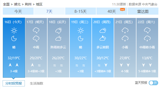 对流天气自西向东影响我省,17日午后,鄂西和江汉平原南部有小到中雨、局部大雨,夜间东移至我省中东部,有中到大雨、局部暴雨。预计过程累计雨量中东部30~70毫米,西部10~30毫米,较大降水区主要位于荆州、荆门、天门、潜江、仙桃、随州、孝感、武汉、黄冈等地,最大小时雨强40~60毫米,短时大风可达8~10级。