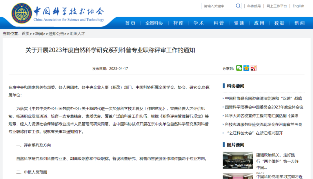 2022年11月,人力资源和社会保障部正式批复同意中国科协组建自然科学研究系列(含科普专业)高级职称(正高、副高)评审委员会。随后,中国科协立即组织专家学者研究评审办法。
