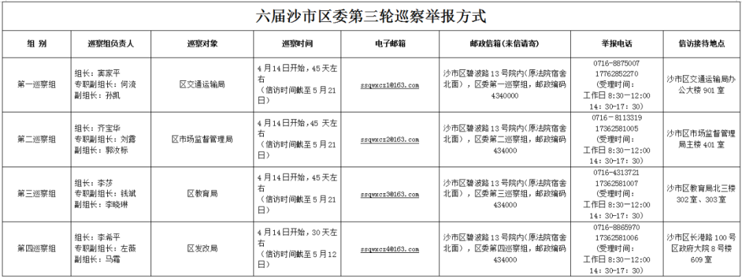 根据沙市区委巡察工作统一部署,3月上旬至7月上旬,六届区委第三轮巡察将对12家区直单位开展常规巡察。截至4月14日,区委4个巡察组已完成对区交通运输局、区市场监督管理局、区教育局、区发改局4家单位的进驻并召开动员会。