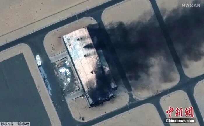 当地时间4月18日,卫星图显示在苏丹麦罗威空军基地(Merowe)燃烧的建筑。