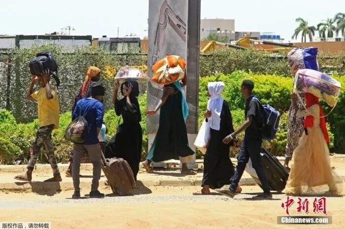图为当地时间4月18日,民众携带行李从喀土穆南部逃离。