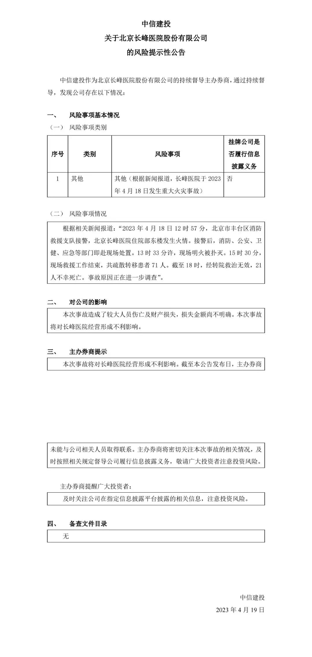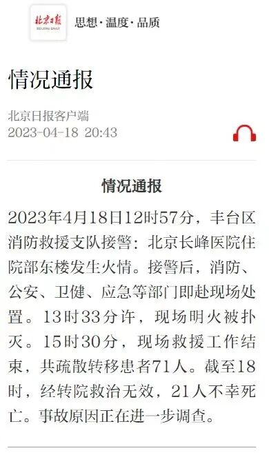 全国中小企业股份转让系统有限责任公司公告截图 18日,北京日报客户端发布情况通报称,2023年4月18日12时57分,丰台区消防救援支队接警:北京长峰医院住院部东楼发生火情。接警后,消防、公安、卫健、应急等部门即赴现场处置。13时33分许,现场明火被扑灭。15时30分,现场救援工作结束,共疏散转移患者71人。截至18时,经转院救治无效,21人不幸死亡。事故原因正在进一步调查。