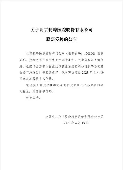 19日,全国中小企业股份转让系统有限责任公司发布公告称,北京长峰医院股份有限公司(证券代码:870890;证券简称:长峰医院)因发生重大风险事件,且未向我司申请停牌,根据《全国中小企业股份转让系统挂牌公司股票停复牌业务实施细则》等相关规定,我司现决定自2023年4月19日起对其股票实施停牌。