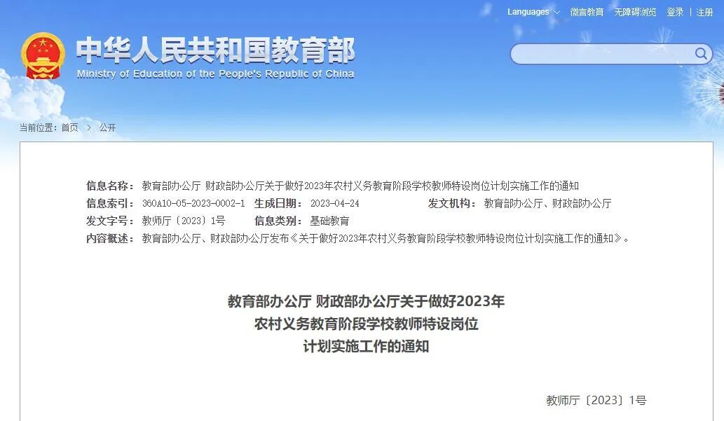 《通知》明确,2023年,中央“特岗计划”仍面向中西部省份实施,重点向原“三区三州”、国家乡村振兴重点帮扶县、少数民族地区等地区倾斜;重点为乡村学校补充特岗教师,引导和鼓励高校毕业生到乡村学校任教;持续优化教师队伍结构,进一步加强道德与法治、体育与健康、外语、科学、劳动、艺术、信息科技、心理健康、特殊教育等紧缺薄弱学科教师的补充。