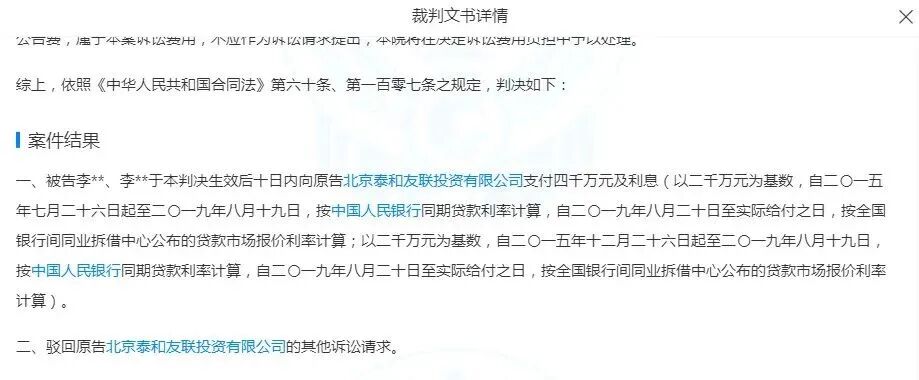 朝阳法院一审判决李亚鹏、李亚炜向泰和友联公司支付4000万元及利息。