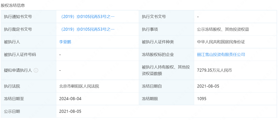 此外,李亚鹏还有7279.35万元丽江雪山投资有限公司的股份被法院冻结。