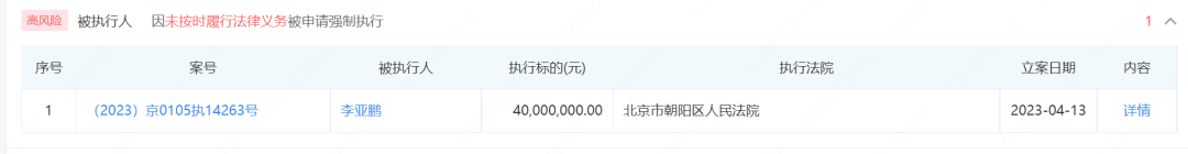 据悉,李亚鹏及其哥哥因未按时履行法律义务,被申请强制执行,于2023年4月13日,被北京朝阳法院执行局立案。