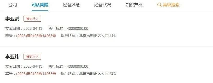 据企查查资料显示,近日,李亚鹏及哥哥李亚炜新增一则被执行人信息,执行标的4000万元,涉及合同纠纷案件,执行法院为北京市朝阳区人民法院。