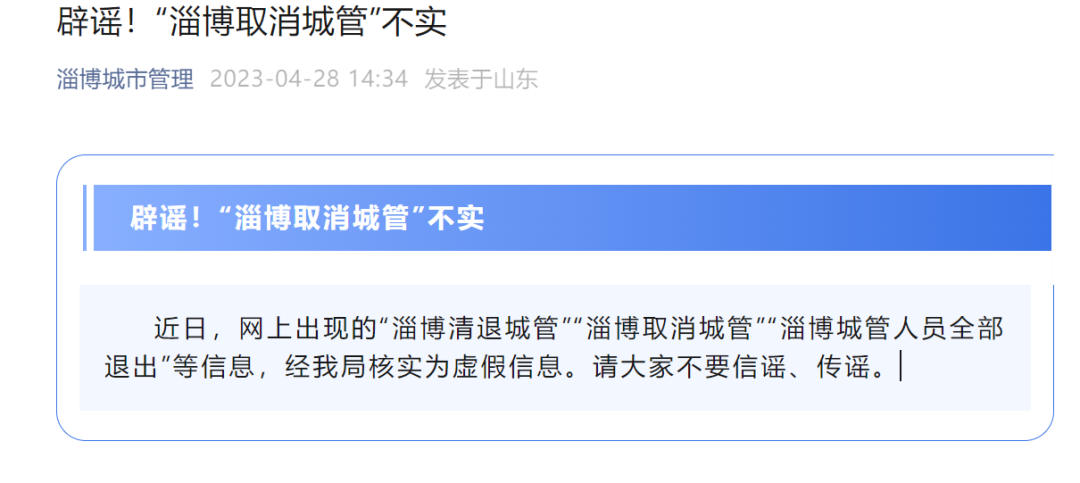 “淄博取消城管”?官方辟谣 2023-04-28 19:41 澎湃新闻 0 4月28日,山东淄博市城市管理局微信公众号“淄博城市管理”发布辟谣消息:近日,网上出现的“淄博清退城管”“淄博取消城管”“淄博城管人员全部退出”等信息,经我局核实为虚假信息。请大家不要信谣、传谣。