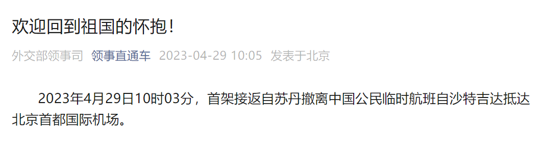 2023年4月29日10时03分,首架接返自苏丹撤离中国公民临时航班自沙特吉达抵达北京首都国际机场。