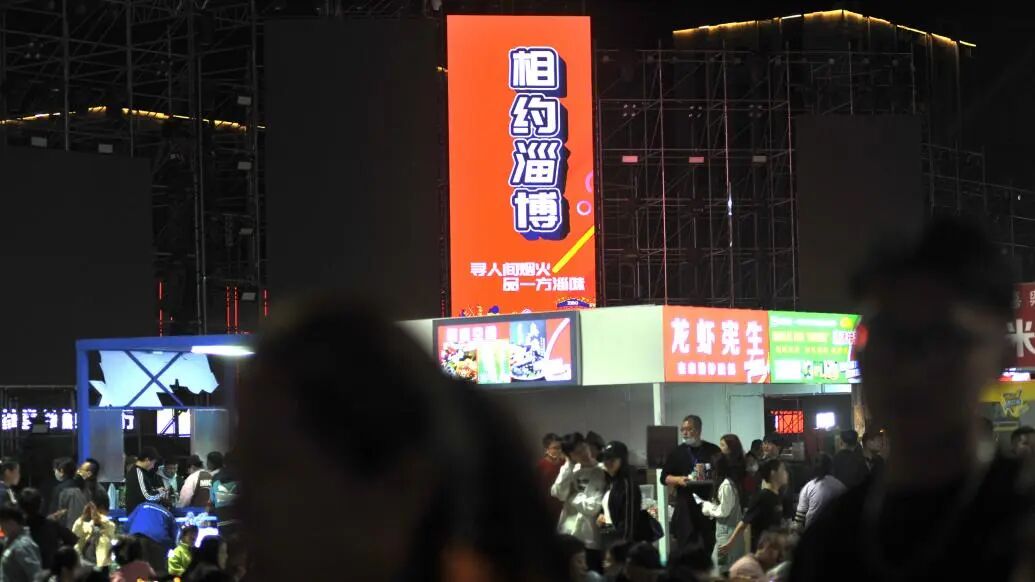 2023年4月29日,山东淄博,“五一”淄博烧烤节主会场海月龙宫体验地,园区内打出了“寻人间烟火 品一方淄味”相约淄博的标语。视觉中国 图