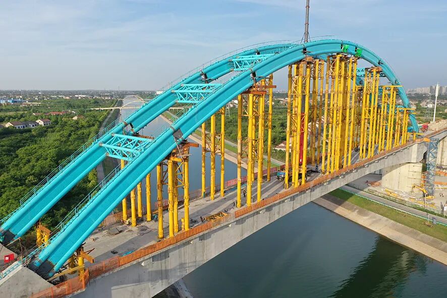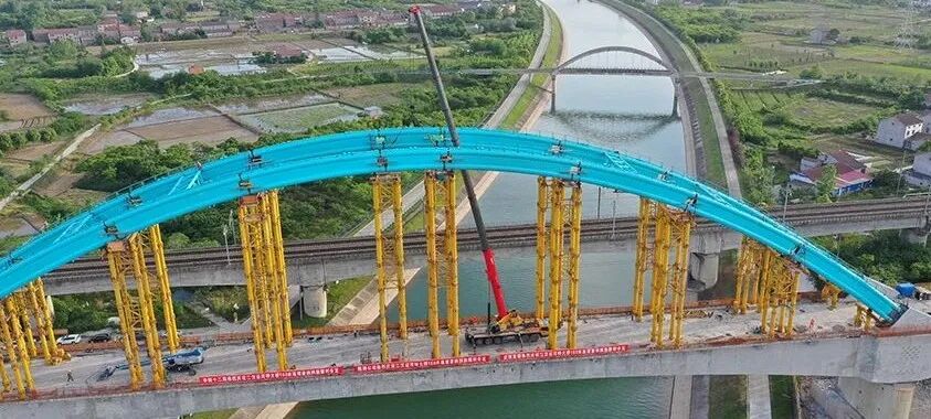 5月1日,伴随着阵阵的节日欢呼声,由中铁十二局承建的荆荆铁路江汉运河特大桥主跨160m系杆拱桥拱肋顺利合龙。