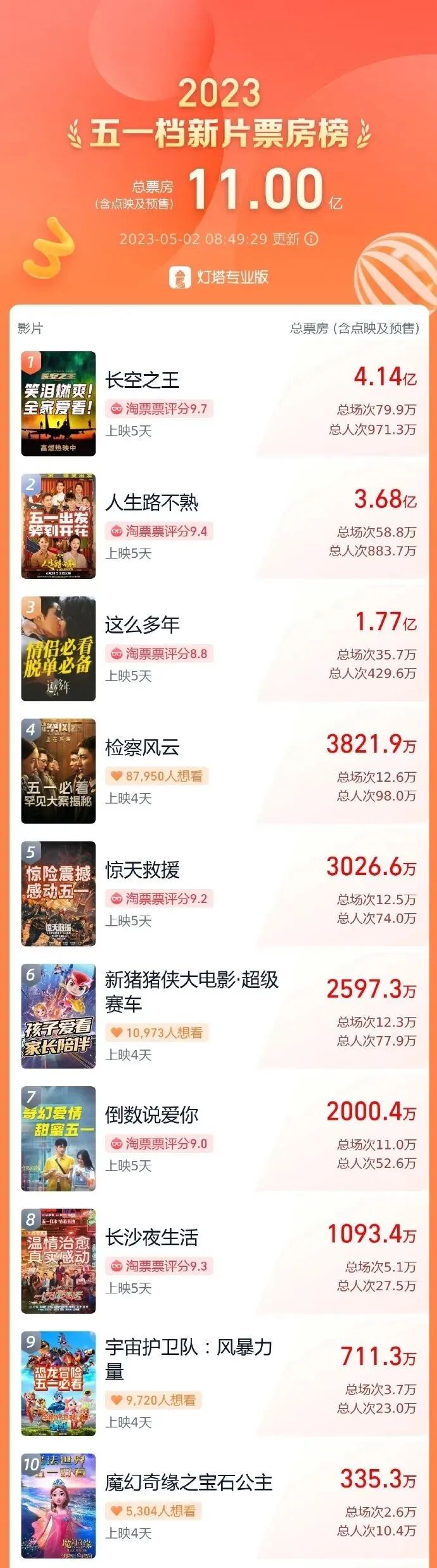 破11亿了! 2023-05-02 16:15 央视新闻、灯塔专业版 0 统计数据显示,截至今天(5月2日)8时49分,2023年“五一档”电影总票房(含预售实时)已突破11亿元。《长空之王》领跑票房榜,《人生路不熟》紧随其后,多部新片集中上映,丰富观众假日选择。 这个“五一档”你看了什么电影?