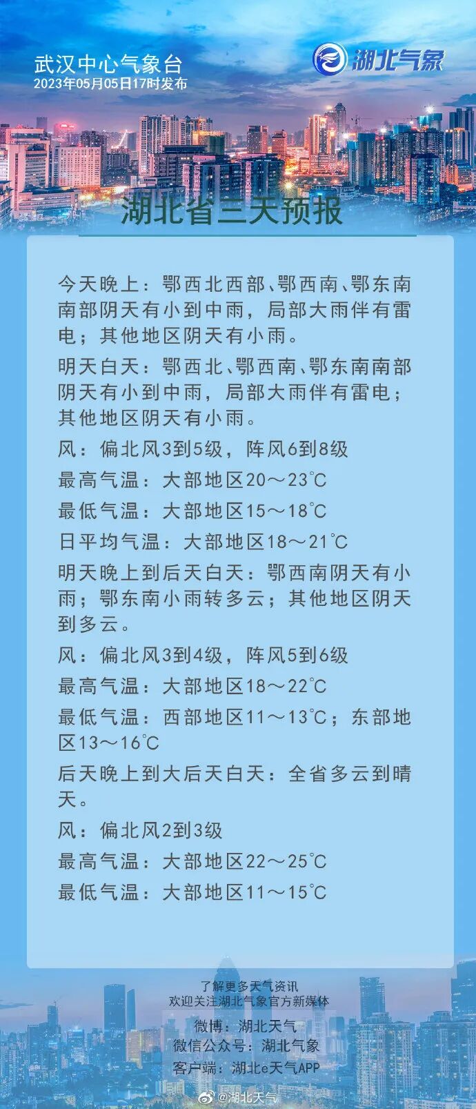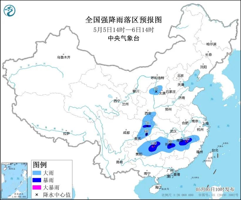 预计,5月5日14时至6日14时,贵州东部、湖南中部、江西中部、浙江西南部、福建西北部以及四川东北部、重庆大部、湖北西部、陕西东南部和北部、山西中部等地部分地区有大到暴雨,其中,湖南西部、江西中部等地局地有大暴雨(100~120毫米)。上述部分地区伴有短时强降水(最大小时降雨量20~50毫米,局地可超过60毫米),局地有雷暴大风等强对流天气。