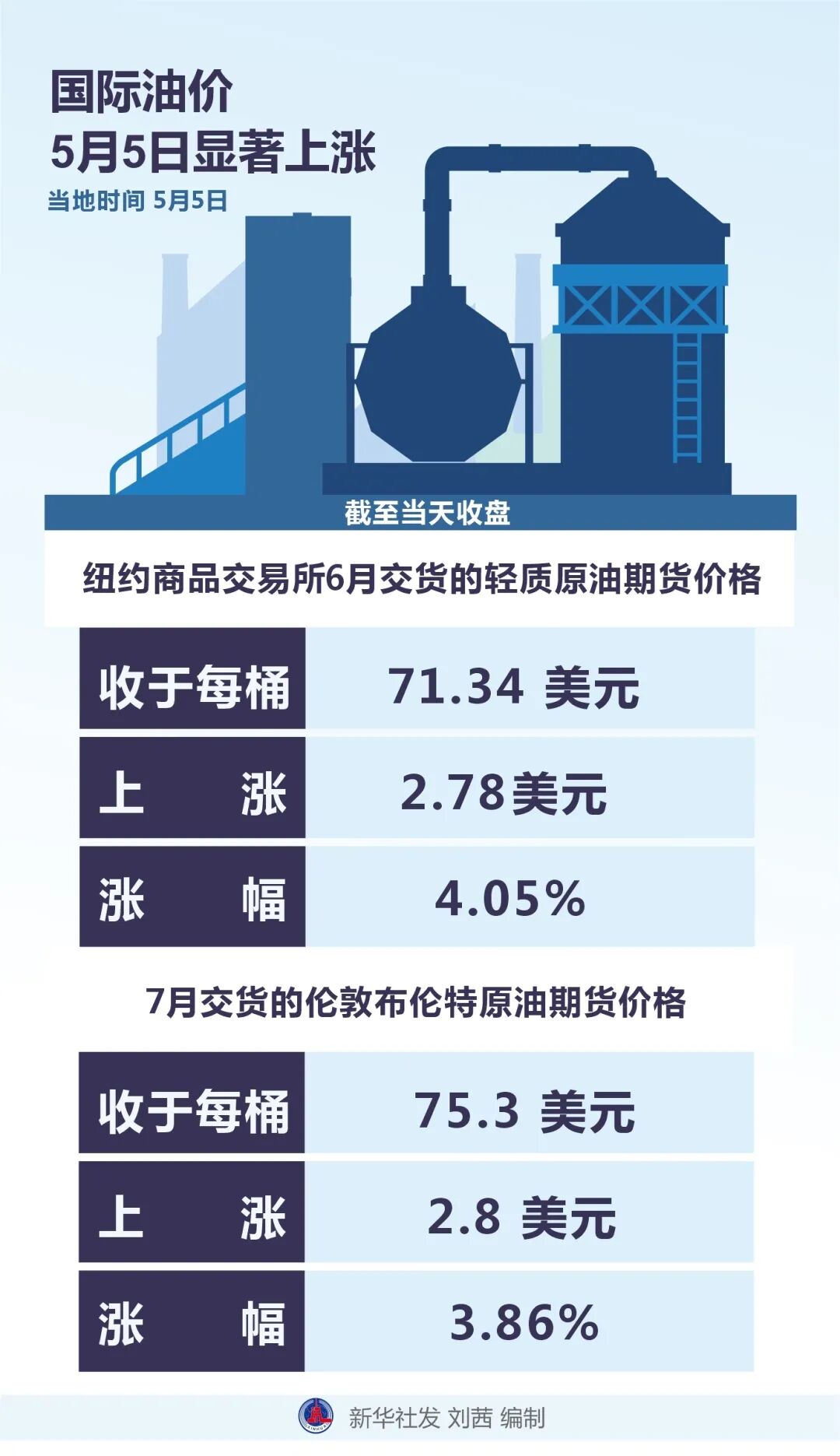 截至当天收盘,纽约商品交易所6月交货的轻质原油期货价格上涨2.78美元,收于每桶71.34美元,涨幅为4.05%;7月交货的伦敦布伦特原油期货价格上涨2.8美元,收于每桶75.3美元,涨幅为3.86%。