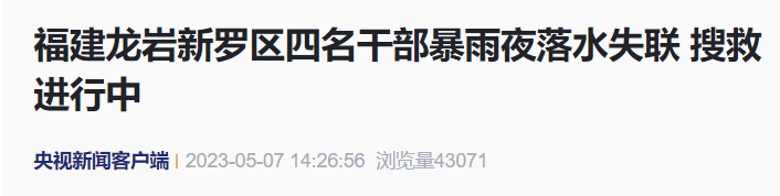 近日,福建龙岩市新罗区遭遇特大暴雨袭击,当地龙川溪水位暴涨。今日凌晨1点40分左右,4名当地干部在龙川溪一座桥上查看水情时,桥梁突然垮塌,4人落水失联。事发桥梁建于1983年,4名落水者中3人为街道干部,1人为村干部,年纪最小的仅25岁。截至5月7日14时,尚未发现四人下落,救援仍在进行中。