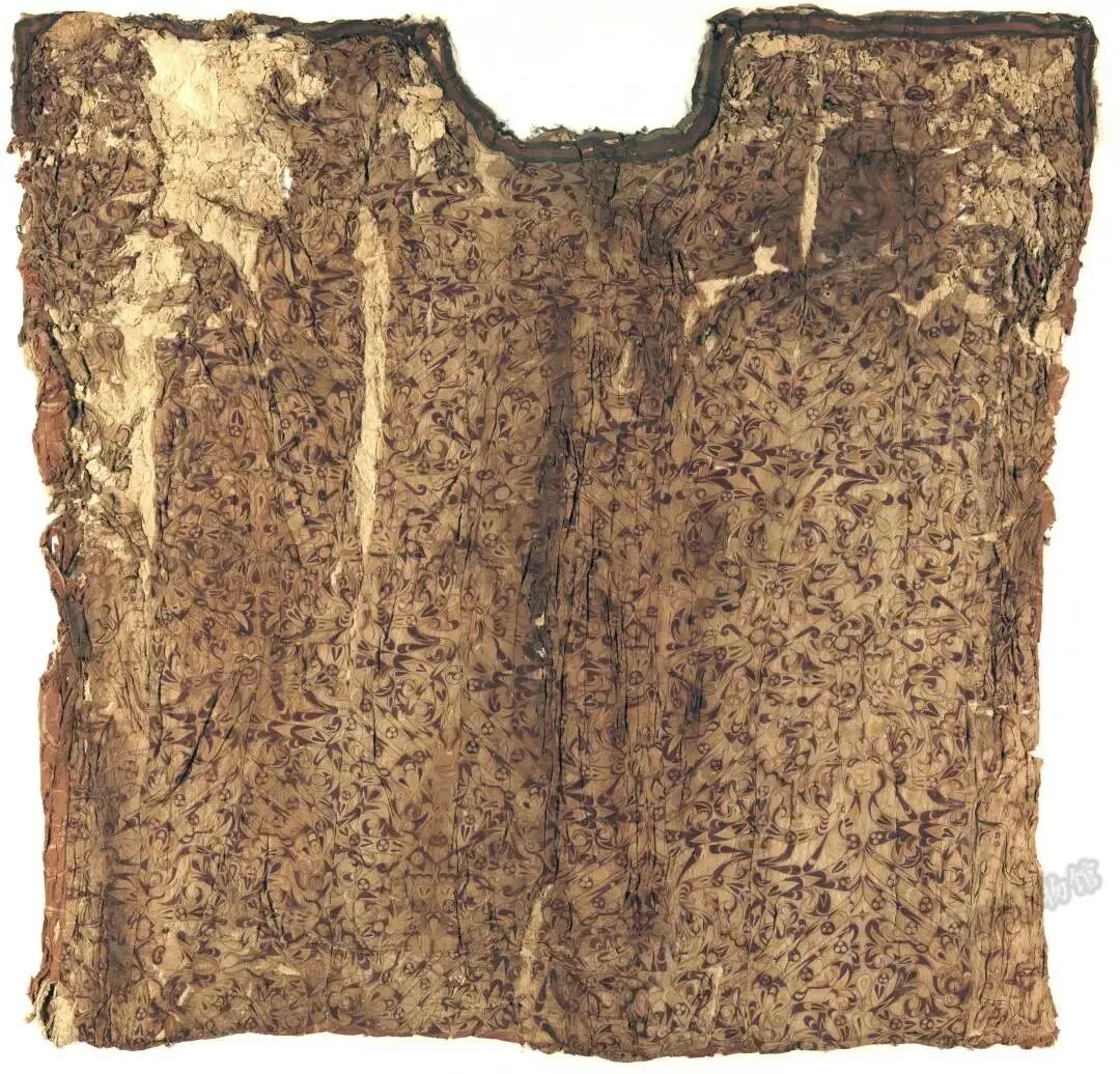 内涵:衣长1.65、袖展1.58米。两袖平直,宽袖口,短袖筒,三角形领。凤鸟花卉纹绣浅黄绢面,缘及两侧用田猎纹、龙凤纹绦、凤鸟菱形纹锦。