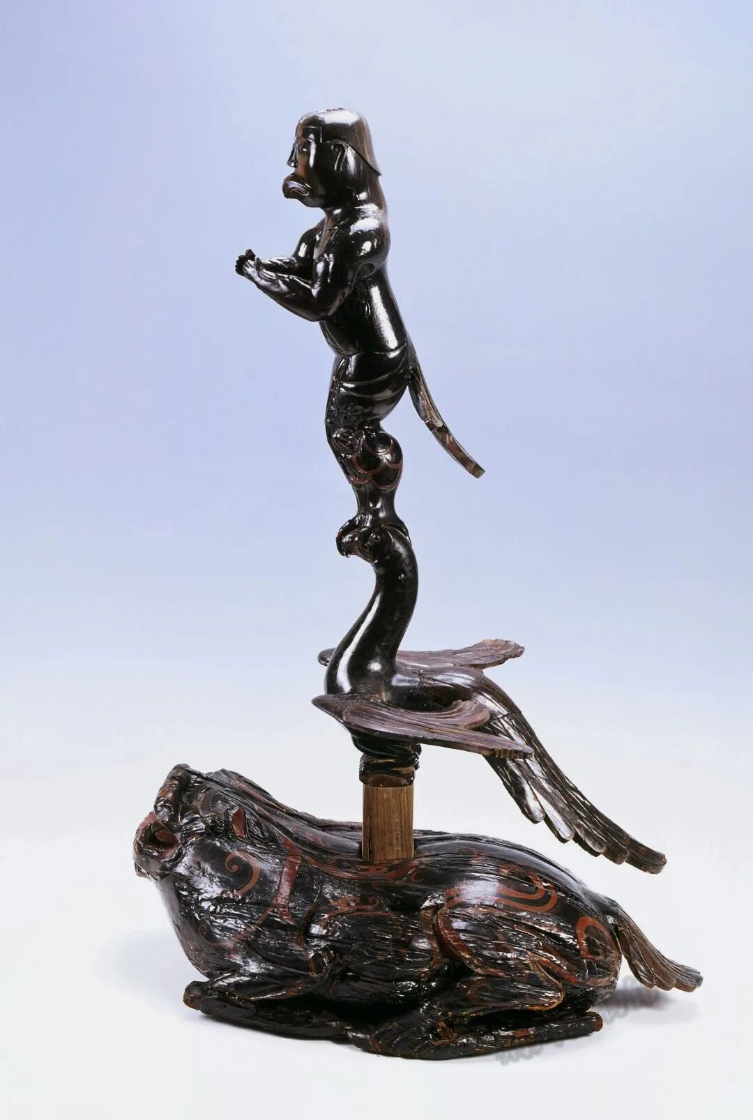 内涵:由羽人、凤鸟、蟾蜍状器座构成,造型独特,寓意深刻,是构思奇特、想象丰富的艺术珍品。《山海经》称“羽人”。