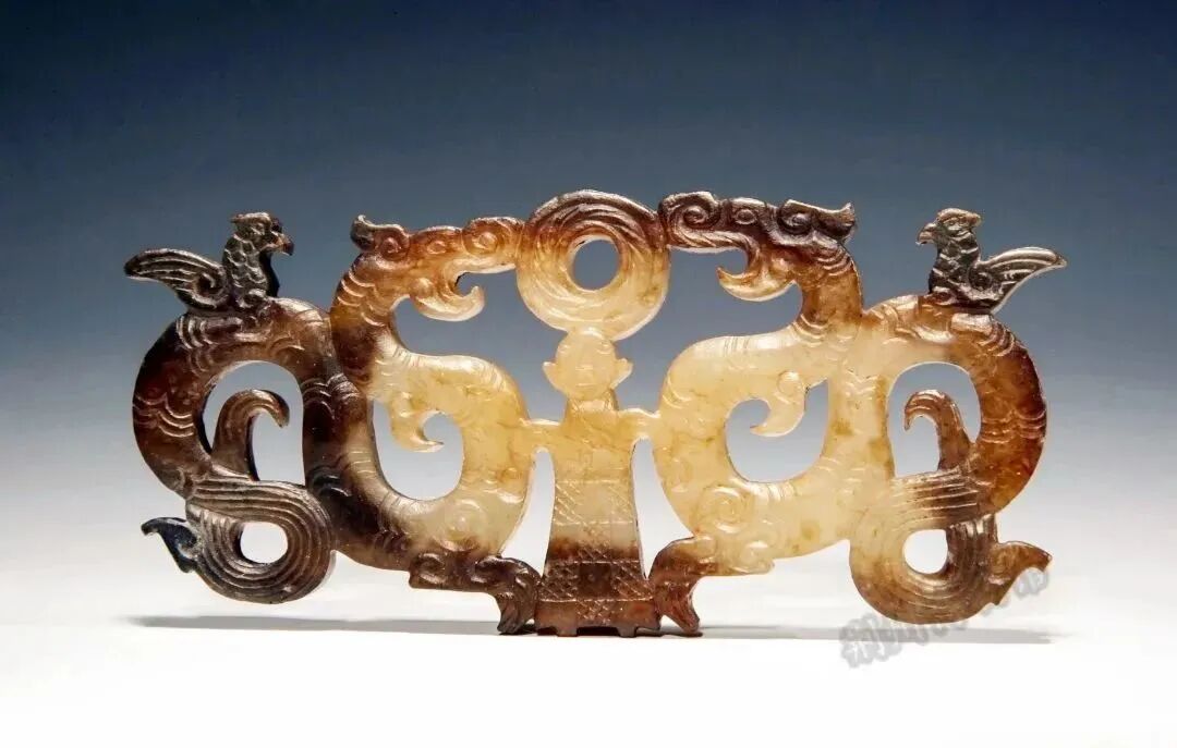 内涵:由一人、二龙、二凤组成。人居中,头顶圆环,双臂各执一龙。二龙相对,龙身虬曲,龙背各栖一凤。造型独特,寓意深刻,浑然天成,巧夺天工。