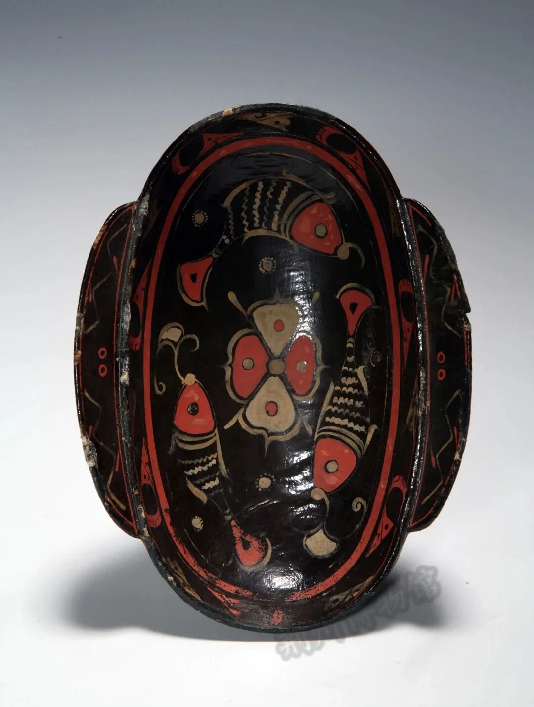 内涵:窄长圆弧形耳。全器髹黑漆为地,用金、黄、红色在耳及口沿描波折纹、圆圈纹、凤鸟纹,在内底中央描绘四叶纹,其周围环绕三条首尾相逐、口衔草叶、栩栩如生的鱼,是西汉早期漆画艺术中的珍品。