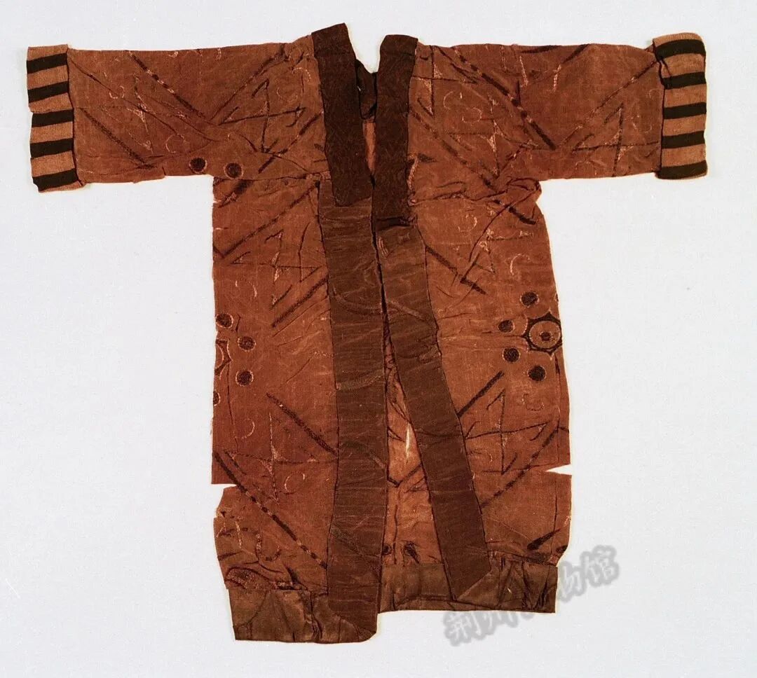 内涵:衣长0.46、袖展0.52、袖宽0.11、腰宽0.26米。出土时置于一小竹笥中,外系竹签牌,自名“衣”,属冥衣。全衣在整块衣料上部左右剪开,上部叠成双袖,下部左右内折成两襟。