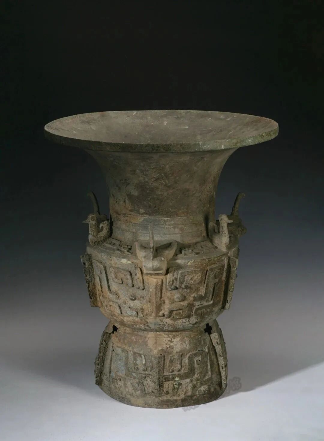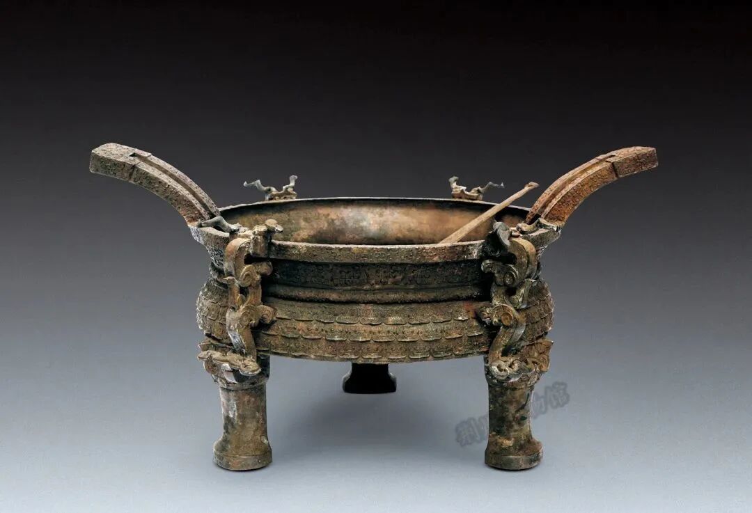 内涵:礼器。形体厚重,肩饰牺首栖鸟,肩、腹、足饰云雷、夔龙、饕餮纹。
