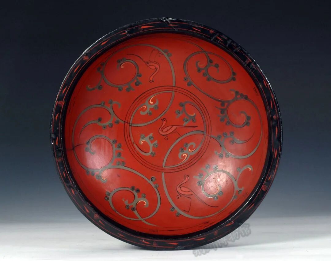 内涵:敞口,平折沿,浅弧腹。器表髹黑漆,器内髹红漆,用朱红、褐色描绘云龙纹及3只凤鸟。
