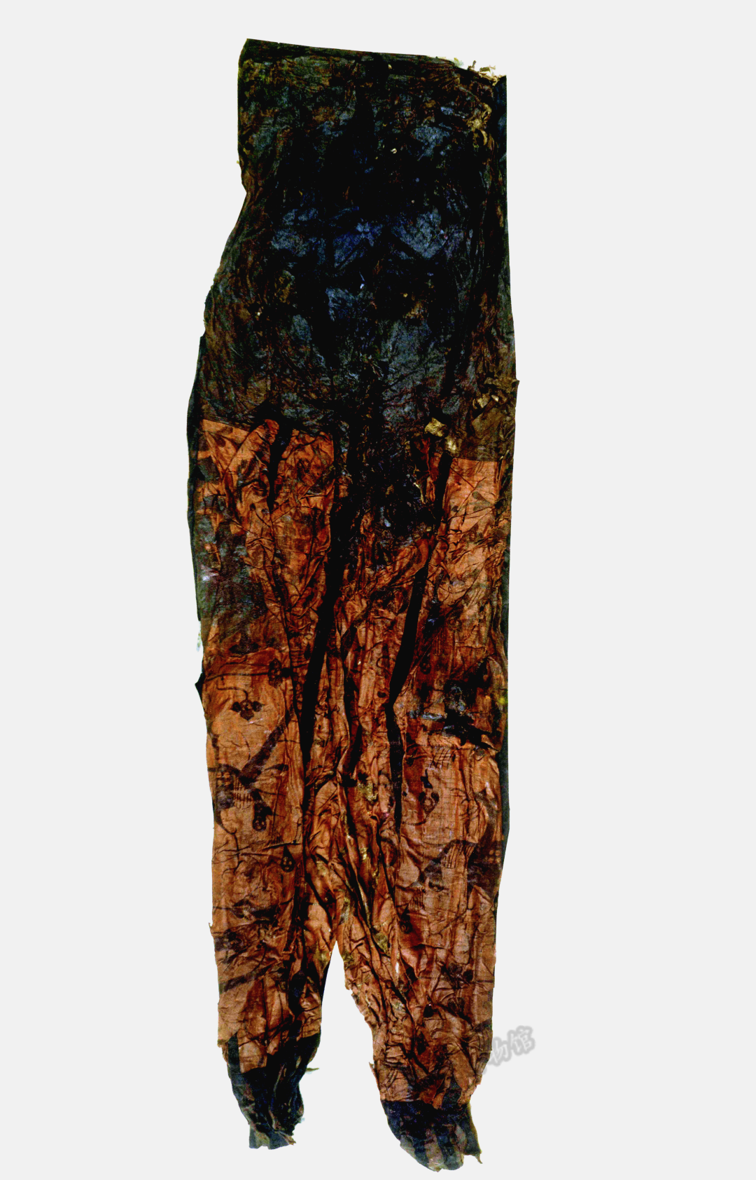 内涵:裤长1.16米,腰宽0.95米,由裤腰、裤裆、裤腿、裤脚组成。裤腰后敞开作开裆形;裤腿均由两片朱红色绢面组成,绣纹面料与里料间絮丝绵以既美观又保暖;裤脚束锦边,有五折叠,形成小裤脚,使整裤形状近似“灯笼裤”。