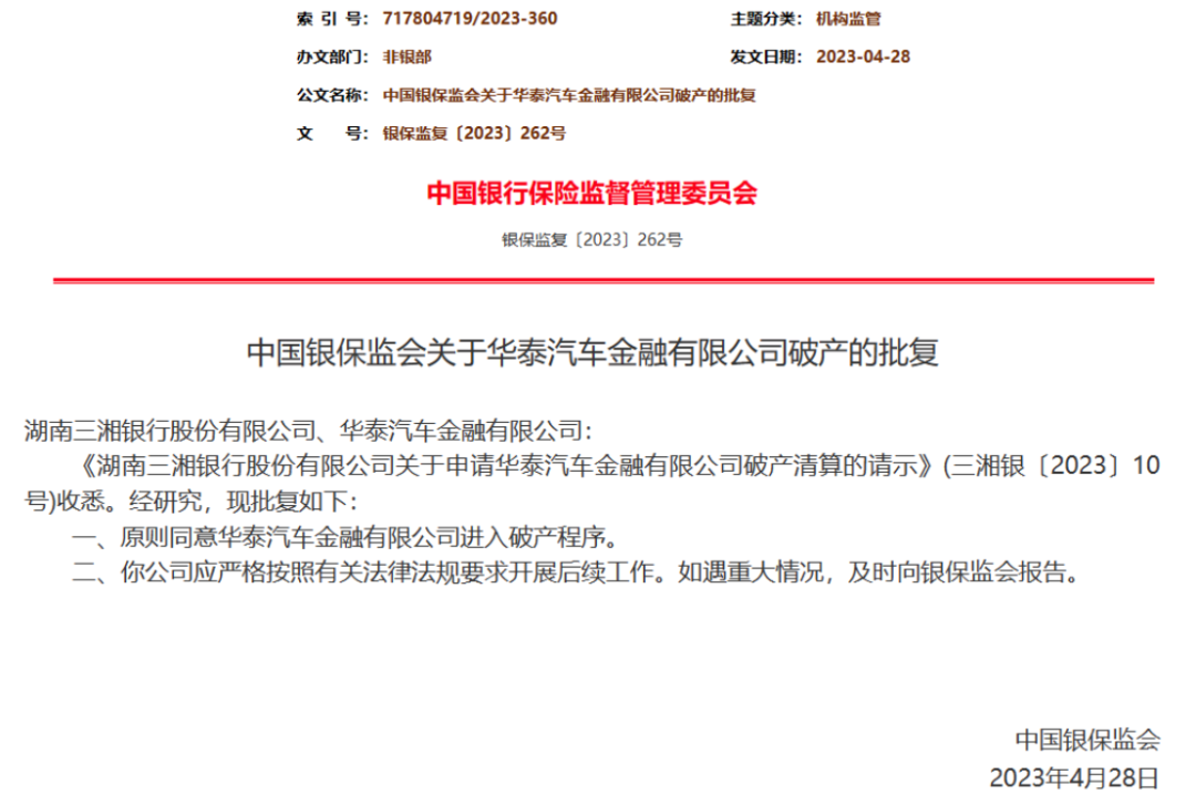 日前,银保监会官网公布了关于华泰汽车金融有限公司破产的批复。银保监会表示,原则同意华泰汽车金融进入破产程序,并要求其严格按照有关法律法规要求开展后续工作。