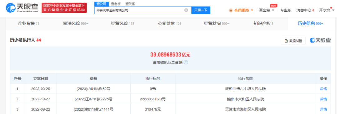 天眼查信息显示,华泰汽车金融涉及大量债务纠纷,并多次成为失信被执行人、下发“限消令”,当前被执行的总金额超过39亿元。